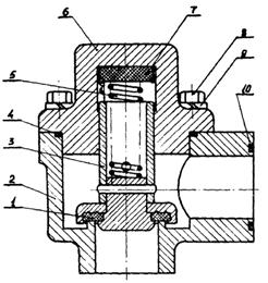 1, 4, 10 - уплотнения; 2 - корпус; 3 - клапан; 5 - пружина; 6 - крышка; 7 - буфер; 8 - болт М10; 9 - шайба пр. 10
