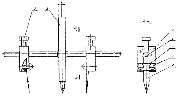 Ножи 7 закрепляются в прорезях держателей 3 с помощью планок 5 и винтов 6. Держатели устанавливаются на рейке 4 соответственно на расстояниях от центра, равных радиусам вырезаемого кольца, и закрепляются стопорными болтами 1.