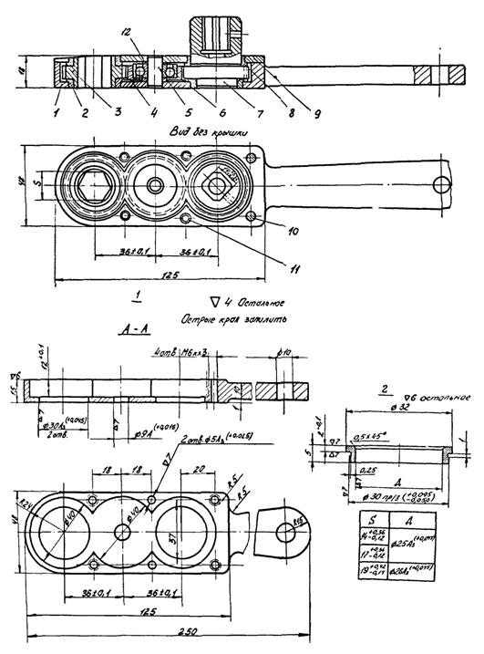 1 - корпус (Ст 3); 2, 8 - втулки (БрАЖМЦ); 3, 4, 7 - шестеренки (сталь 40ху); 5 - ось (сталь 45); 6 - подшипник (ГОСТ 7242-54); 9 - крышка (Ст 3); 10 - винт М6×15; 11 - цилиндрический штифт; 12 - шайба (Ст 3)
