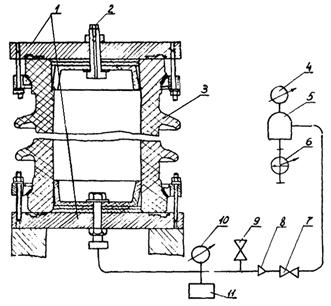 1 - приспособление для сборки изолятора; 2 - болт; 3 - изолятор; 4 и 10 - манометры; 5 - воздушный колпак; 6 - гидравлический насос; 7 и 9 - вентили; 8 - обратный клапан; 11 - ресивер