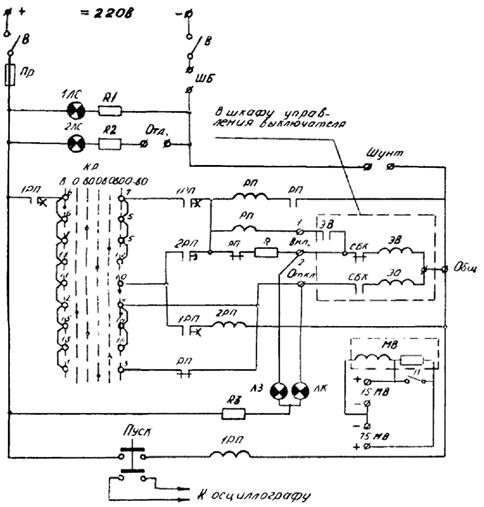 В - тумблер ТВ-1-1; Пр - предохранитель 5А; ШБ - штекер безопасности; П - переключатель (тумблер Тв-2-1); КР - ключ режима работы (переключатель ПМОФ); 1ЛС - коммутаторная лампа КМ-3; 2ЛС - коммутаторная лампа КМ-3; R1, R2, R3 - резисторы ПЭ-25 (3 кОм, 25 Вт); ЛЗ - коммутаторная лампа КМ-3; ЛК - коммутаторная лампа КМ-3; РП - промежуточное реле РП-232 (220 В, 4 А); 1РП - промежуточное реле РП-252 (U = 220 В); 2РП - промежуточное реле РП-252 (U = 220 В); ЭВ - электромагнит включения; ЭО - электромагнит отключения; СБК - сигнально-блокировочные контакты; МВ - милливольтметр М-45М; R - добавочный резистор 70 В