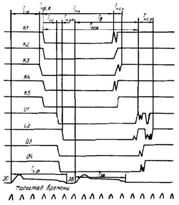Тс.о. - собственное время отключения (от подачи команды до первого размыкания контактов камеры); Тн.р.к. - неодновременность размыкания контактов камеры; Тп.к. - бесконтактная пауза камеры (от последнего размыкания контактов камеры до их первого вибрационного смыкания); Тз.о - запаздывание размыкания контактов отделителя относительно контактов камеры; Тн.с.к - неодновременность смыкания контактов камеры; Тн.р.о - неодновременность размыкания контактов отделителя; Тв - время включения; Тн.с.о - неодновременность смыкания контактов отделителя; ТАПВ - минимальная бесконтактная пауза при АПВ; Тэ.о - длительность отключающего импульса; Тэ.в - длительность включающего импульса