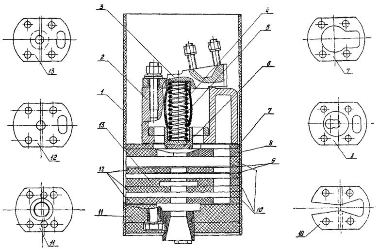 1 - экран; 2 - корпус; 3 - держатель: 4 - гибкие связи; 5 - пружина; 6 - неподвижный контакт; 7, 11 - 13 - гетинаксовые пластины (ГОСТ 2718-74); 8, 10 - фибровые пластины (ГОСТ 14613-69); 9 - картонная пластина (ГОСТ 4194-68)
