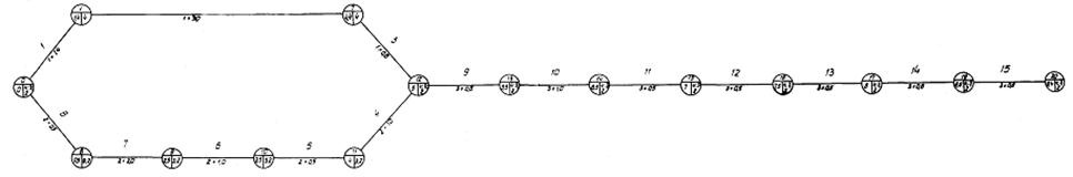 При записи виброграммы ход линейки приспособления на рис. 20 соответствует ходу подвижного контакта (S1 = 235 мм), а скорость движения подвижного контакта равна скорости движения линейки приспособления и определяется по виброграмме. Для этого производится разбивка виброграммы на пролеты, равные длинам волн. Расстановка отметок ведется с первой (считая от конца B) вершины. Средние скорости движения подвижных контактов (м/с), численно равные длине пролетов (см), обозначаются на виброграмме в пролетах.