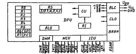 В состав логического символа процессора входят: восемь регистров общего назначения (RO-R7), среди которых R6 играет роль указателя стека (SP), a R7 - счетчика команд (PC); регистр состояний (RS), включающий признаки: N - знака, Z - нуля, V - переполнения, С - переноса, Т - разряда слежения, I/O - приоритета программы, арифметико-логическое устройство (ALU); устройство управления (CU) с регистром команд (RI); устройства управления магистралью (MCU) с прямым допуском к магистрали (DMA); прерывания (ICU); блок питания (BLC); генератор синхронизации (CLG); блок управления регенерацией динамической памятью (BRGN).