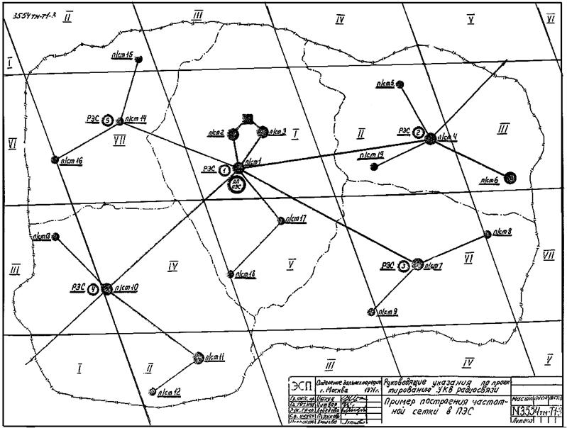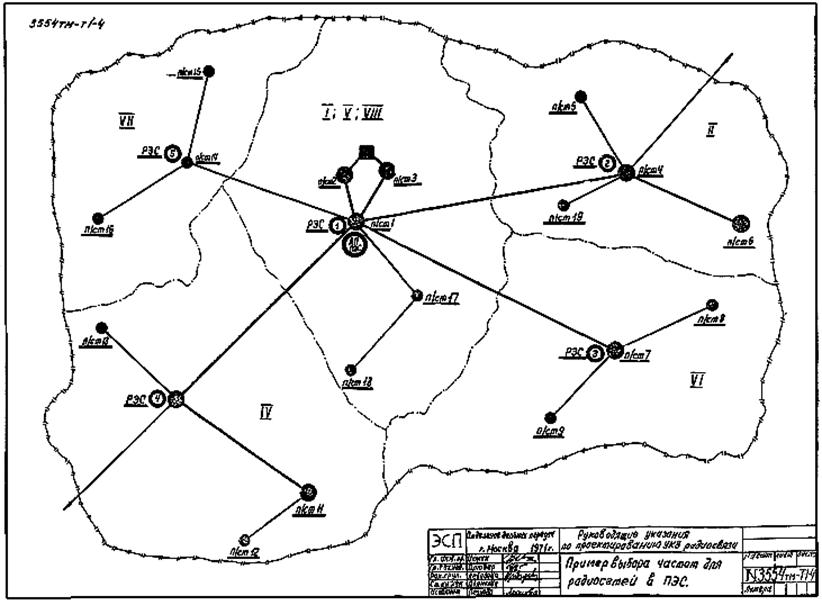 При указанном распределении радиочастот между центральными радиостанциями, имеющими одинаковые частоты, обеспечивается расстояние около 100 км, чем практически исключается влияние между радиосетями. (Пример распределения частот приведен на чертежах № 3554тм-т1-4, 5).