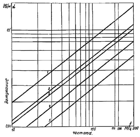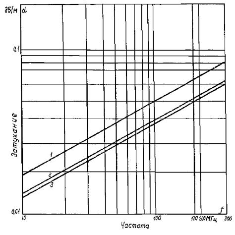 Рис. 1 Частотная зависимость величины затухания для кабелей марок: