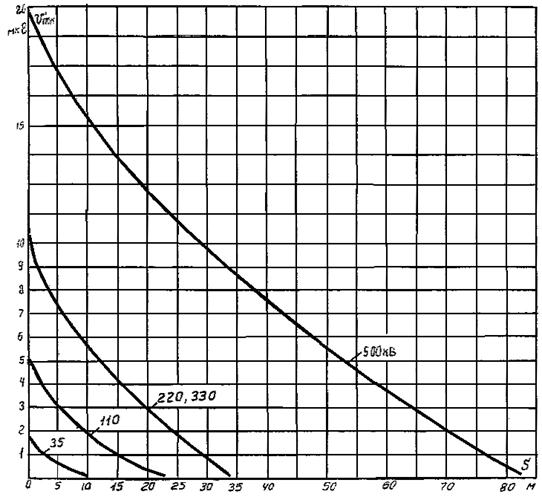 Рис. 12. График для определения помех, излучаемых высоковольтным оборудованием подстанции 35 - 500 кВ