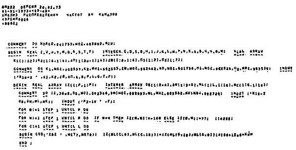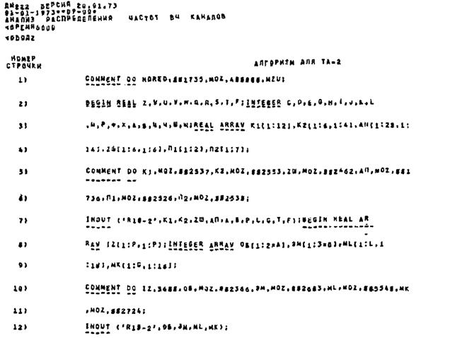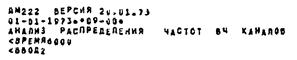 При работе программы анализа распределения частот предварительно на МБ-0 вызывается ИС22, затем вводится карта начала работы оттранслированной программы и оттранслированная программа (возможно считывание оттранслированной программы с магнитной ленты, при этом не нужна колода перфокарт рабочей программы). Вслед за этим должны быть введены те массивы числового материала, которые неизменны для всех расчетов по программе: массивы АП, ZШ, К1, К2. Это осуществляется нулевым блоком рабочей программы: