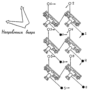 4.7. Примеры обмыва опорных и аппаратных изоляторов показаны на рис. 13 - 19, где обозначено: ● - позиция 1-го оператора (ведущего), ○ - позиция 2-го оператора (ведомого). Цифрами показана очередность обмыва изоляторов при данном направлении ветра.