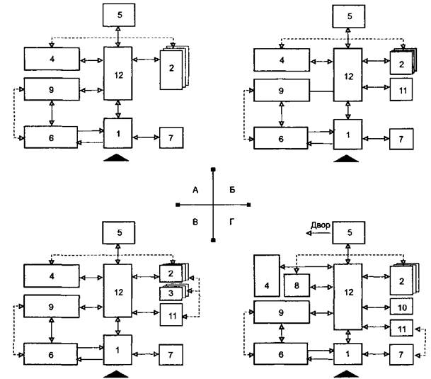 3.10 При формировании объемно-планировочной структуры зданий следует проектировать удобные функциональные связи вестибюля с помещениями милиции и охраны порядка; санпропускника с жилыми группами через вестибюль; помещений общественного питания с санитарно-гигиеническими и административно-бытовыми помещениями (рисунок 3.1).