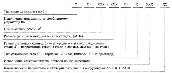 Пример условного обозначения аппарата с неразъемным корпусом 1 гладкой рубашкой 2 номинальным объемом 10 м3, рабочим давлением в корпусе 0,6 МПа, коррозионно-стойкого исполнения К, с торцовым уплотнением Т, исполнения привода по взрывозащите 1ExdIIBT4, климатического исполнения У3: