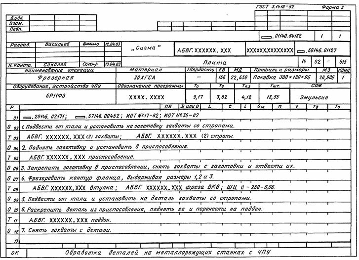 Пример оформления ОК, когда масса заготовки превышает допустимые нормы поднятия тяжестей вручную.