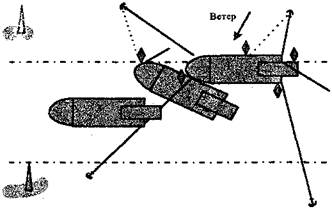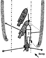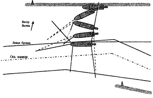 25 мая в 14 ч 00 мин, в связи с усилением северо-западного ветра до семи, восьми баллов, дноуглубительные работы были прекращены и земснаряд стал для отстоя на левой наветренной бровке на рабочих тросах с опущенной на грунт черпаковой рамой (рисунок 3, положение 1).