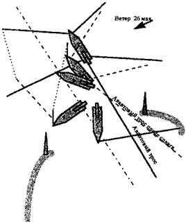 27 мая утром ветер усилился до семи, восьми баллов и нос земснаряда стал заваливаться к оси входного створа (положение 3). По судну был объявлен аврал и начали экстренную съемку с участка: