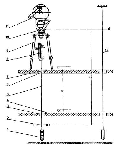 А.2.3 Опускают с верхнего перекрытия стенда до уровня устройства 2 канат вспомогательного отвеса 12. Расстояние между отвесами должно быть не менее 2 м.