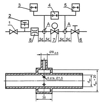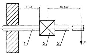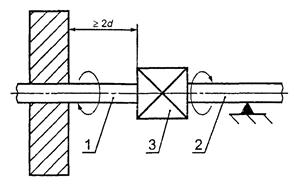 а) к трубе 1 (рисунок 5) на расстоянии, равном или большем 2d от устройства, прикладывают крутящий момент в соответствии с таблицей 4 для времени испытания 10 с;