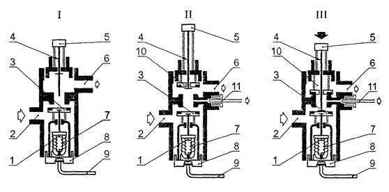 1 - вход газа; 2 - магнитная пробка клапана; 3 - клапан; 4 - шпиндель; 5 - кнопка; 6 - выход газа к основной горелке; 7 - электромагнит; 8 - резьбовое соединение электромагнита с термопарой; 9 - термопара; 10 - клапан прерывателя; 11 - выход газа к запальной горелке