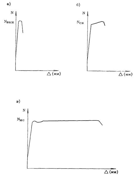 - если произойдет выкалывание бетона, в котором анкеруется закладная деталь, то разрушение будет носить хрупкий характер с весьма незначительными абсолютными деформациями, предшествующими выключению связи из работы (рис. 3а);