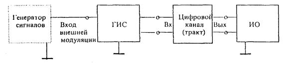 Проверку устойчивости к фазовому дрожанию и фазовому дрейфу цифровых сигналов на входе стыковой цепи рекомендуется проводить методом, использующим критерий появления ошибок [8]. Измерение производится по схеме рисунка 10, где применяется ГИС с возможностью введения фазового дрожания и фазового дрейфа в измерительный сигнал и ИО. Частота фазового дрожания, если так предусмотрено в ГИС, может устанавливаться от внешнего генератора синусоидальных сигналов, диапазон частот которого должен соответствовать диапазону частот допустимого (по ГОСТ 26886) фазового дрожания испытываемого стыка.