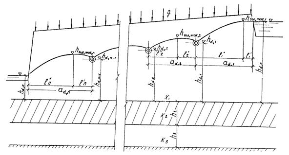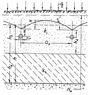 DH - превышение напора в нижележащем горизонте над уровнем воды в дренах;