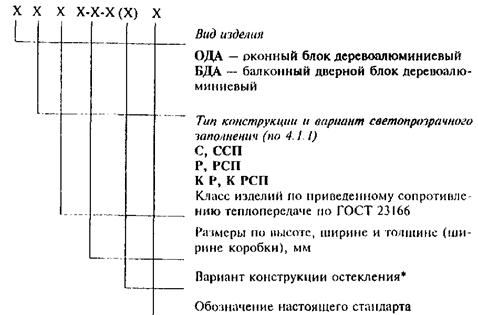Примечание - Балконные дверные блоки классифицируют по этому же принципу, при этом в обозначении изделий буквенный индекс «О» заменяют на «Б», например, БДА С - балконный дверной блок деревоалюминиевый спаренной конструкции с листовым стеклом.