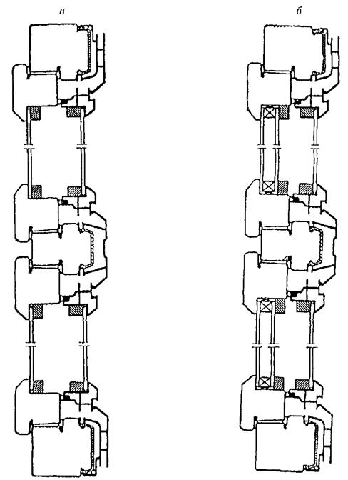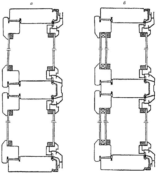 Соединения внутренних и наружных створок изделий спаренной конструкции рекомендуется уплотнять по контуру, при этом в нижней и верхней части следует предусматривать разрывы 20-50 мм в уплотнении для предотвращения образования и удаления конденсата.