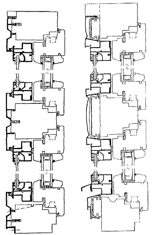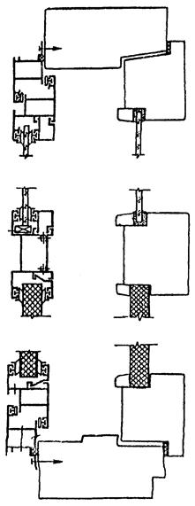 Примеры конструкций угловых соединений алюминиевых створок приведены на рисунке А.3, а угловых соединений деревянных створок и коробок - на рисунке А.4.