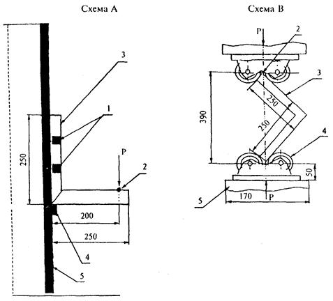 1 - съемные хомуты крепления; 2 - точка приложения нагрузки; 3 - образец; 4 - упор (для схемы В - ролики); 5 - опора