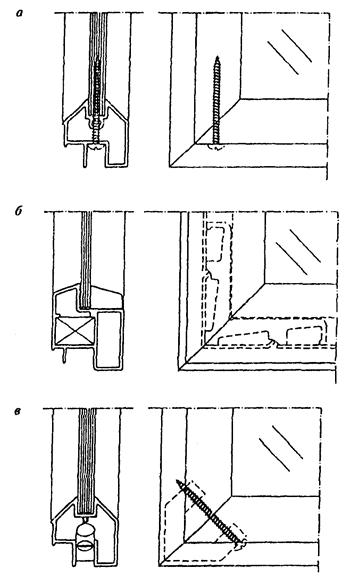 а - при помощи самонарезающих винтов; б - при помощи опрессовки угловых вкладышей; в - при помощи углового вкладыша и типового соединения