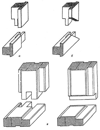 а - конструкция шипового углового соединения створки; б - конструкция комбинированного углового соединения створки; в - конструкция шипового углового соединения коробки