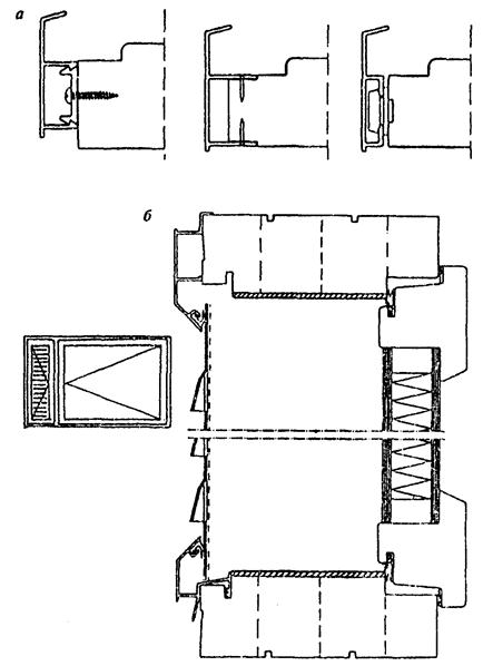а - примеры крепления алюминиевых облицовок деревянных коробок; б - пример конструкции клапанной створки с вентиляционной решеткой и глухим заполнением внутренней части (на рисунке приведен пример облицовки брусков коробки, облицованной сверхтвердой древесно-волокнистой плитой)