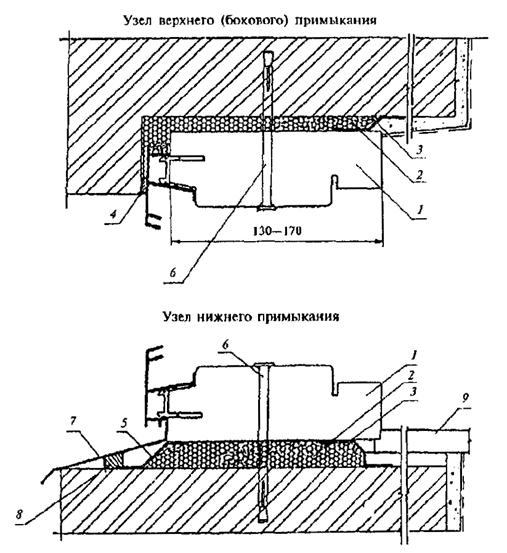 Требования к монтажу изделий устанавливают в проектной документации на объекты строительства согласно принятым в проекте вариантам исполнения узлов примыкания изделий к стенам, рассчитанным на заданные климатические и другие нагрузки, с учетом требований ГОСТ 30971 и нормативной документации на крепежные, изоляционные и другие материалы, применяемые для монтажа изделий. Пример монтажного узла примыкания оконного блока к стеновому проему приведен на рисунке Б.1.