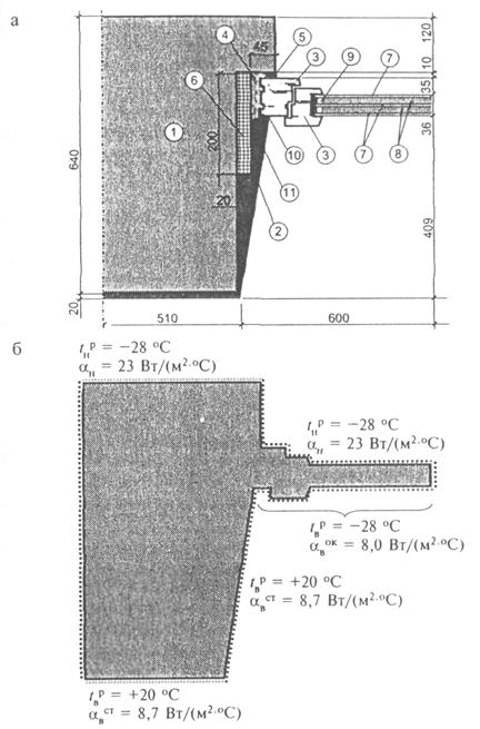 1 - кирпичная кладка, λ = 0,8 Вт/(м·°С); 2 - цементно-песчаный раствор, λ = 0,93 Вт/(м·°С); 3 - древесина поперек волокон, λ = 0,22 Вт/(м·°С); 4 - монтажная пена, λ = 0,05 Вт/(м·°С); 6 - экструдированный пенополистирол, λ = 0,05 Вт/(м·°С); 7 - стекло, λ = 0,76 Вт/(м·°С); 8 - воздушная прослойка 12 мм, λэкв = 0,08 Вт/(м·°С); 9 - алюминий, λ = 220 Вт/(м·°С); 10 - герметик, λ = 0,34 Вт/(м·°С); 11 - пароизоляционная лента, λ = 0,56 Вт/(м·°С)