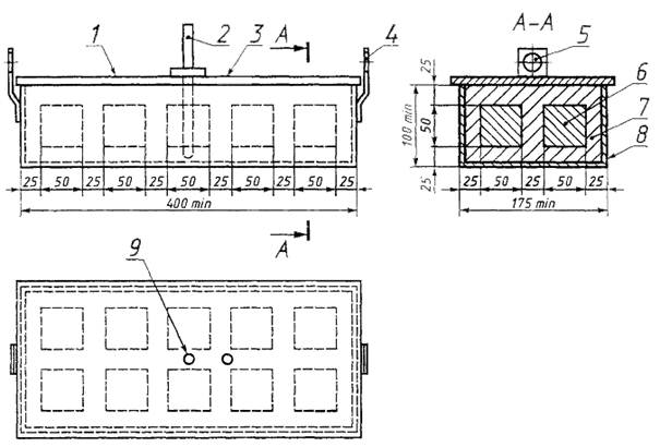 1 - крышка; 2 - термопара в чехле; 3 - вентиляционное отверстие; 4 - скоба; 5 - отверстие для подъемного стержня; 6 - испытуемый образец; 7 - коксовая засыпка; 8 - камера; 9 - отверстие для термопары