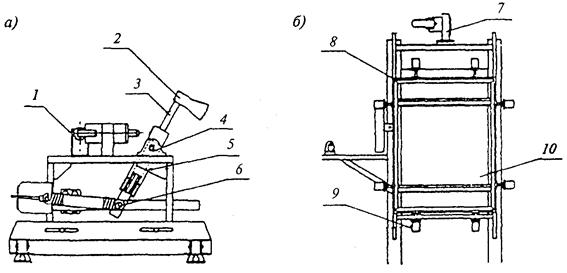 1 - головка топора; 2 - рукоятка; 3 - стальная пластина; 4 - зажимное приспособление; 5 - винты; 6 - резиновая полоса; 7 - ось вращения