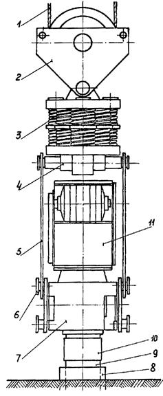 1 - мачта бурового станка; 2 - талевая система; 3 - амортизатор; 4 - вибромеханизм; 5 - самозаклинивающийся захват; 6 - извлекаемая обсадная труба; 7 - пульт управления