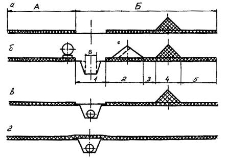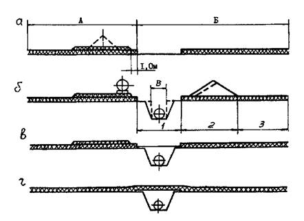 2.6. Избыток минерального грунта распределяют по полосе рекультивации продольным проходом бульдозера ДЗ-18, ДЗ-27 или автогрейдером ДЗ-40Б и уплотняют бульдозером. После выполнения этой операции полоса рекультивации должна представлять собой выемку с четко обозначенными краями (рис. 1в).