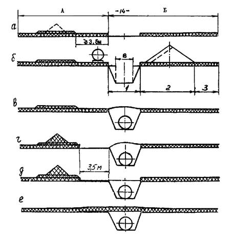 2.4. Траншею разрабатывают перемещающимися по полосе, свободной от плодородного слоя почвы, экскаваторами (рис. 1б), марки которых в зависимости от диаметров сооружаемых трубопроводов приведены в прил. 1, 2.