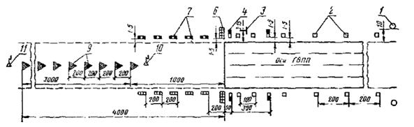 1 - знак центра полосы; 2 - пограничные знаки; 3 - посадочный знак «Т»; 4 - знак зоны приземления; 5 - угловой знак; 6 - входной знак; 7 - знак боковых границ КПБ (зон подхода); 8 - осевой знак КПБ; 9 - знак дневные ориентиры; 10 - ближний приводной радиомаркер; 11 - дальний приводной радиомаркер