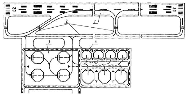 1 - искусственная взлетно-посадочная полоса; 2 - рулежные дорожки; 3 - перрон; 4 - места стоянки