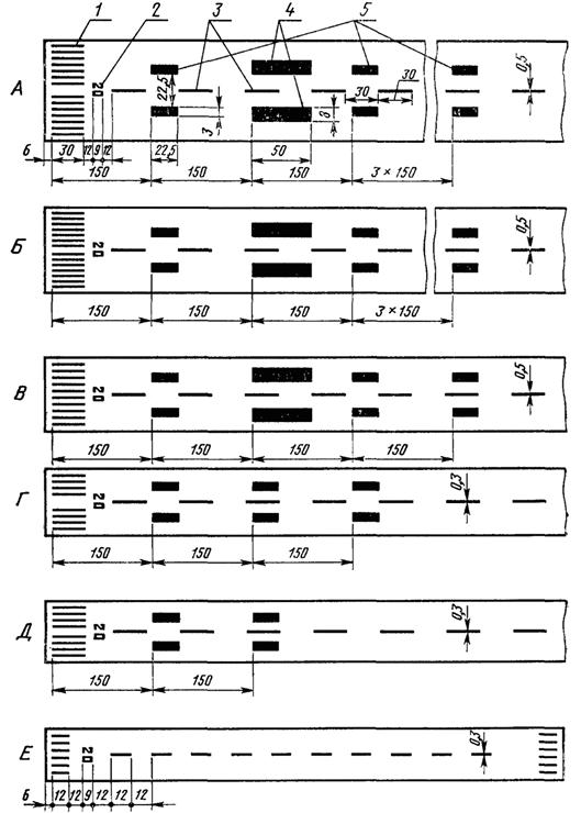 А Б В, Г, Д и Е - классы аэродромов; 1 - порог; 2 - цифровой знак ПМПУ; 3 - ось ИВПП; 4 - фиксированное расстояние; 5 - зона приземления