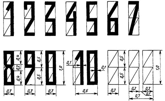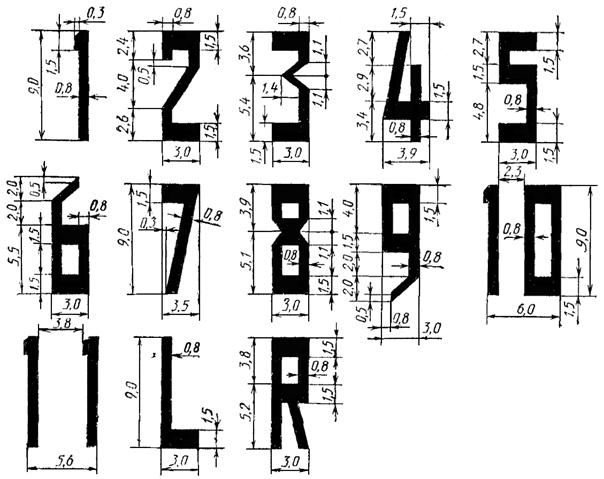 4.4. Цифры, обозначающие порядковый номер места стоянки для всех классов аэродромов, наносят на расстоянии 2 м впереди Т-образного знака. Форма цифр и размеры приведены на черт. 9.