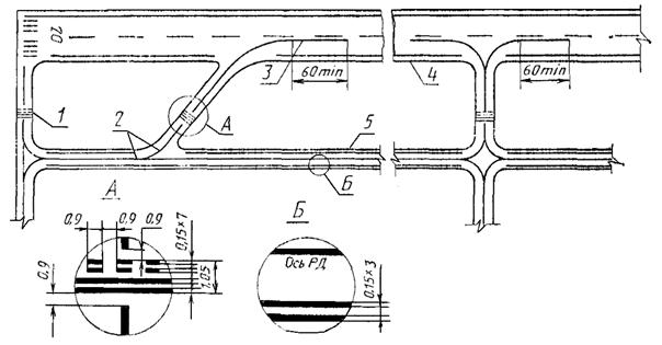 1 - место ожидания самолетов; 2 - ось РД; 3 - участок сопряжения РД с ИВПП; 4 - край ИВПП; 5 - рулежная боковая маркировочная полоса