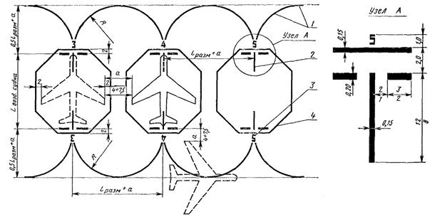 Расстояние между осями руления по прямой и поперечными линиями Т-образного знака должно равняться половине размаха крыла расчетного типа самолета, плюс безопасное расстояние oт стоящего самолета до двигающегося самолета или препятствия (а = 4 - 7,5м).