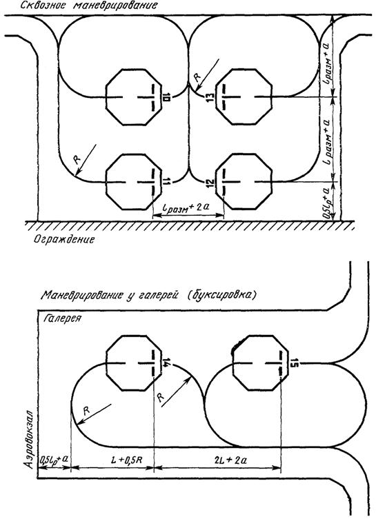 4.2. Заход самолета на стоянку при помощи тягача, а также выход самолета со стоянки на тяге собственных двигателей или при помощи тягача осуществляется по кривой соответствующей эксплуатационному радиусу поворота. Заход самолета на стоянку на тяге своих двигателей производится по кривой соответствующей минимальному радиусу поворота самолета. Линии захода самолета на тупиковую стоянку маркируют по кривой, соответствующей эксплуатационному радиусу.
