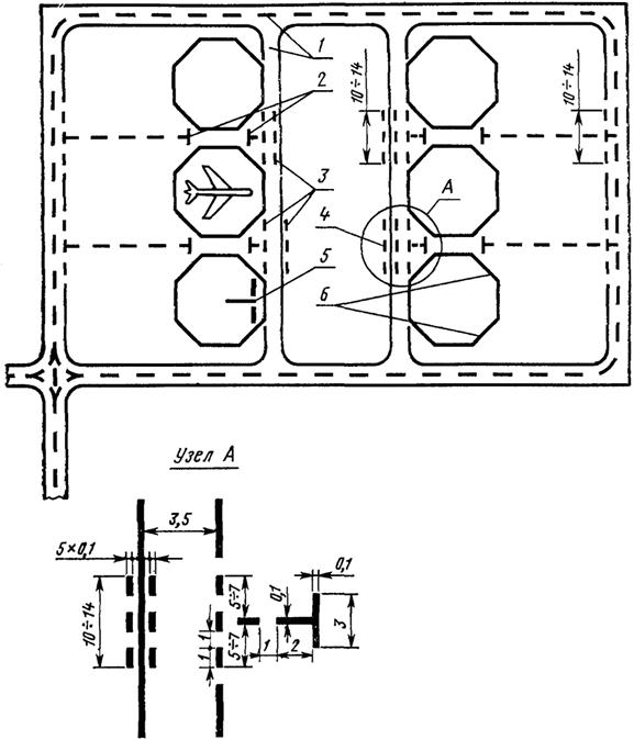 1 - пути движения специальных машин; 2 - знак Т для остановки специальных машин; 3 - пунктирные линии, разрешающие въезд или выезд специальных машин; 4 - место вынужденного въезда или выезда; 5 - знак остановки самолета; 6 - контур зоны обслуживания