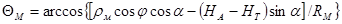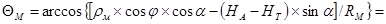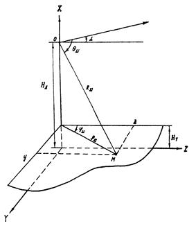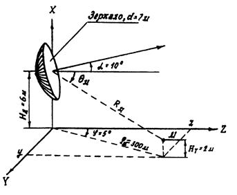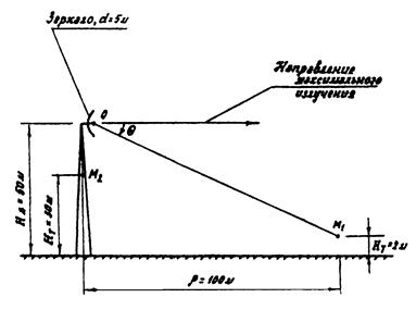 Техническое средство - ССП. Передатчик работает на длине волны l = 0,05 м. Мощность передатчика Р = 3 кВт. Используется антенна Кассегрена с углом раскрыва 2y0 = 180° и D0 = 50 дБ. Диаметр апертуры d = 7 м. Высота центра апертуры над землей НА = 6 м. Направление максимального излучения составляет с плоскостью горизонта угол a = 10°. Постановка задачи иллюстрируется рис. 14.