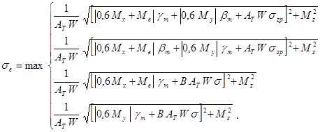 Оценка прочности на действие несамоуравновешенных нагрузок выполняется по формулам метода предельного состояния. Расчет на действие всех нагружающих факторов проводится по методу максимального эквивалентного напряжения. Если в последнем случае не выполняется условие приспособляемости, то проводится дополнительный расчет на циклическую прочность, в том числе и с учетом ползучести.