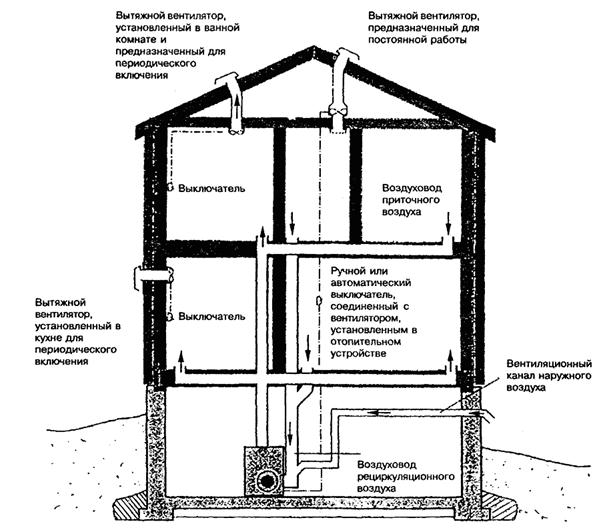 8.3.1 В доме, оборудованном вентиляцией с механическим побуждением, приточные вентиляционные каналы должны обеспечивать поступление наружного воздуха через приточные отверстия воздуховодов. Подача воздуха обеспечивается приточным вентилятором, к которому через воздухозаборное устройство поступает наружный воздух. Удаление воздуха из помещений должно обеспечиваться вытяжным вентилятором, устанавливаемым в чердачном помещении. Наружный воздух в таких системах перед поступлением в воздуховоды проходит систему фильтров и подогревается до температуры, которую обитатели дома считают комфортной.